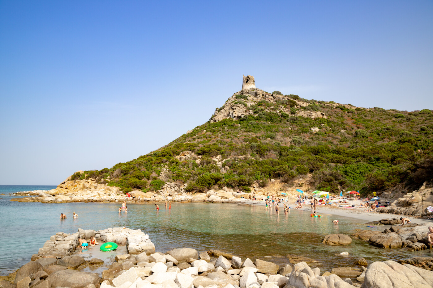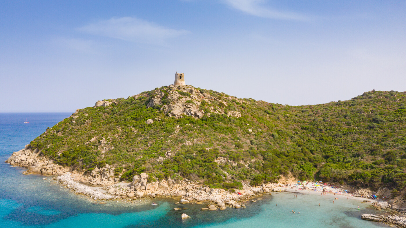Das flach abfallende Ufer macht den Strand für Familien gut nutzbar, während das ruhige Wasser auch zum Schnorcheln und für Stand-up-Paddling geeignet ist. Im Hintergrund setzt die Torre di Porto Giunco einen markanten Akzent und macht diesen Strand zu einem der bekanntesten Küstenabschnitte rund um Villasimius.